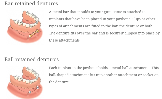 There are two kinds of implant-supported dentures. These are bar- or ball-retained dentures. In both cases, the dentures will be very similar to your present acrylic dentures. Porcelain or acrylic teeth that look like natural teeth are attached to this base.